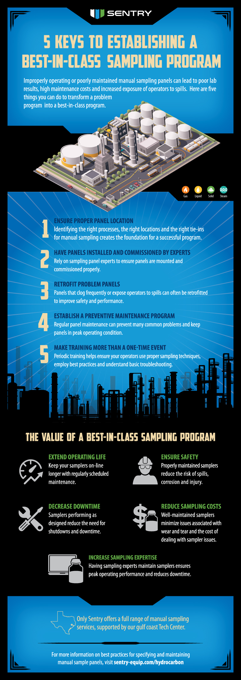In the oil and gas industry, sampling hydrocarbon liquids, such as crude oil, related cuts, condensates, and oil and water mixtures, is critical to ensuring quality control, identifying corrosion and ensuring processes are operating as expected. However, improperly operating or poorly maintained manual sampling panels can lead to poor lab results, high maintenance costs and increased exposure of operators to spills. Keep your operators safe, remain in environmental compliance and maximize uptime by transforming your sampling program to top notch one.